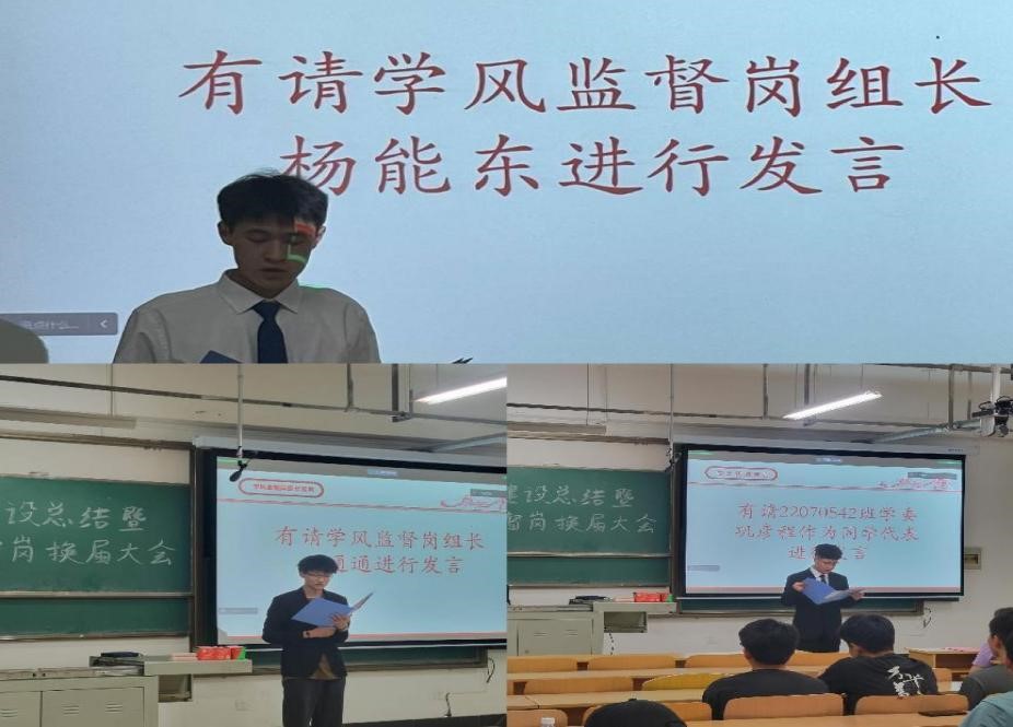 接下来,学风监督岗新任负责人鹿殷、组长王通通和杨能东结合查课、早操早读、乐跑、博士下午茶、22级新生成长导师启动仪式等内容回顾了本学期学风建设情况。之后,22070542班学习委员巩彦程作为优良学风班级代表发言,分享了本班学风建设的经验。