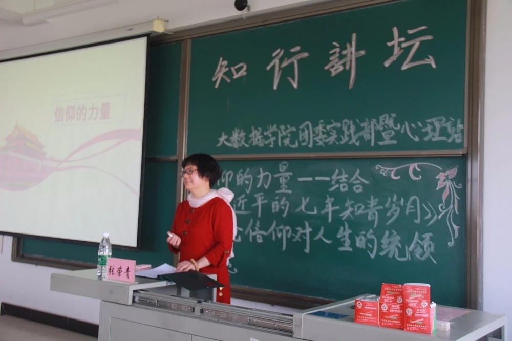 何为信仰?信仰即为对某种思想或宗教以及对某人某物的信奉和敬仰,并把它奉为自己的行为准则。为了让同学们进一步深刻了解信仰的力量,2018年4月28日下午4时30分,我院在15610举办了以“信仰的力量”为主题的知行讲坛,此次活动我院有幸邀请到现任山西广播电视台外宣中心制片人、山西儒文化研究理事会成员的张荣青老师,参加此次活动的有大数据学院学生科卫星老师以及我院部分学生。