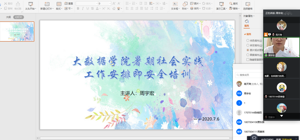 为了做好学院大二年级学生的暑期社会实践工作,提高疫情期间学生的安全防护工作,大数据学院暑期社会实践工作安排暨安全培训于2020年7月6日腾讯会议举行,上午10:00首先进行班长工作会议,对班长工作进行安排部署,并于上午11:00-11:30,下午3:30-4:00两个时间段对18级同学进行相关培训,大数据学院团委周宇宏老师为此次培训的主讲人。