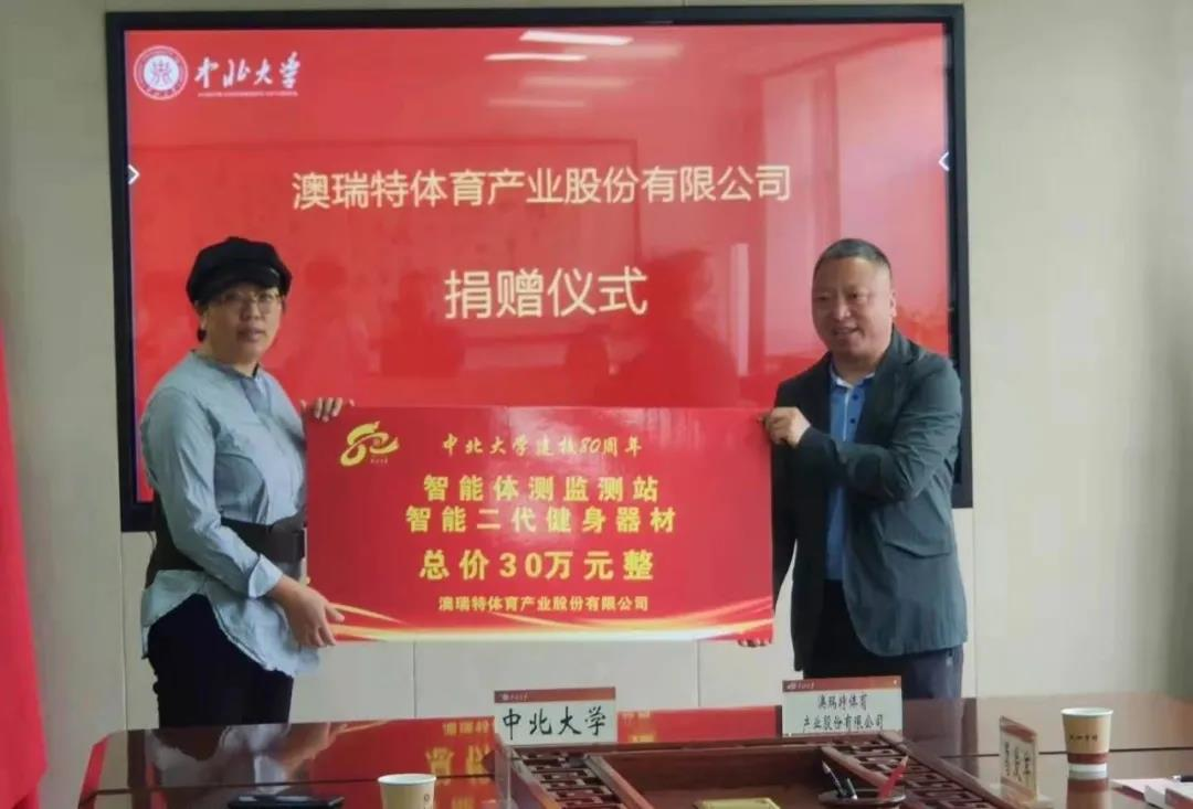 捐赠仪式上,澳瑞特董事长郭旭刚代表企业向中北大学捐赠了澳瑞特公司畅销的室外智能体测站、二代健身路径器材等数台。