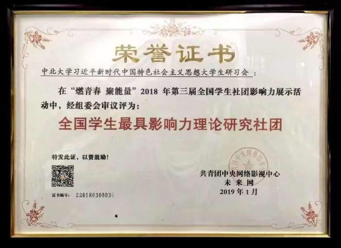 以学习出精髓、活动出精品、人员出精英的“三精”为目标,中北大学习近平新时代中国特色社会主义思想大学生研习会先后荣获“2022 年全国‘三下乡’社会实践优秀品牌项目”、“2021-2022 学年全国高校活力团支部”、“全国最具影响力理论研究社团五十强”等国家级荣誉。社团入选团中央“'推普助力乡村振兴’全国大中专学生暑期社会实践志愿服务活动”、入选2022年中国青年志愿者“七彩假期”暑期社会实践队伍、入选2022年团中央“强国有我,'核’你一起”大学生志愿宣讲团队。涌现出了“中国大学生自强之星”党书畅、吴正浩、蔡奕明、孙宇飞,“第十三届中国青年志愿者优秀个人”蔡奕明,参加团团暑期夏令营的罗坤等一批优秀社团成员 。