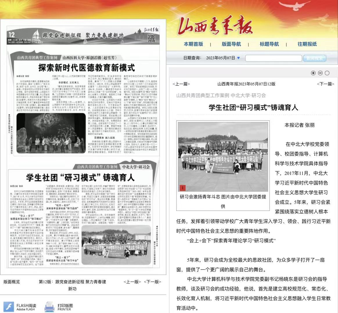 2023年05月07日,中北大学习近平新时代中国特色社会主义思想大学生研习会作为山西共青团典型工作案例荣登山西青年报12版。