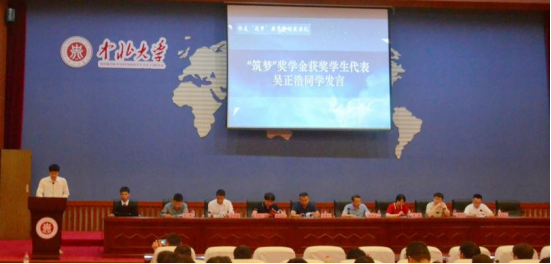 会议第二项,进行“筑梦”奖、助学金颁奖典礼。杨晓东副书记介绍了“筑梦”奖、助学金的评选要求及评选人数,由工作人员宣读了荣获学业优秀奖、模范标兵奖、突出贡献奖、学业进步奖、助学金的同学名单,并由校院领导及校友代表颁发相关证书。吴正浩同学、袁艳欣同学代表荣获“筑梦”奖学金、助学金的优秀学生发言,表达了对获得此次“筑梦”基金的感恩之情及此次校友奖学金对学生的重要意义。