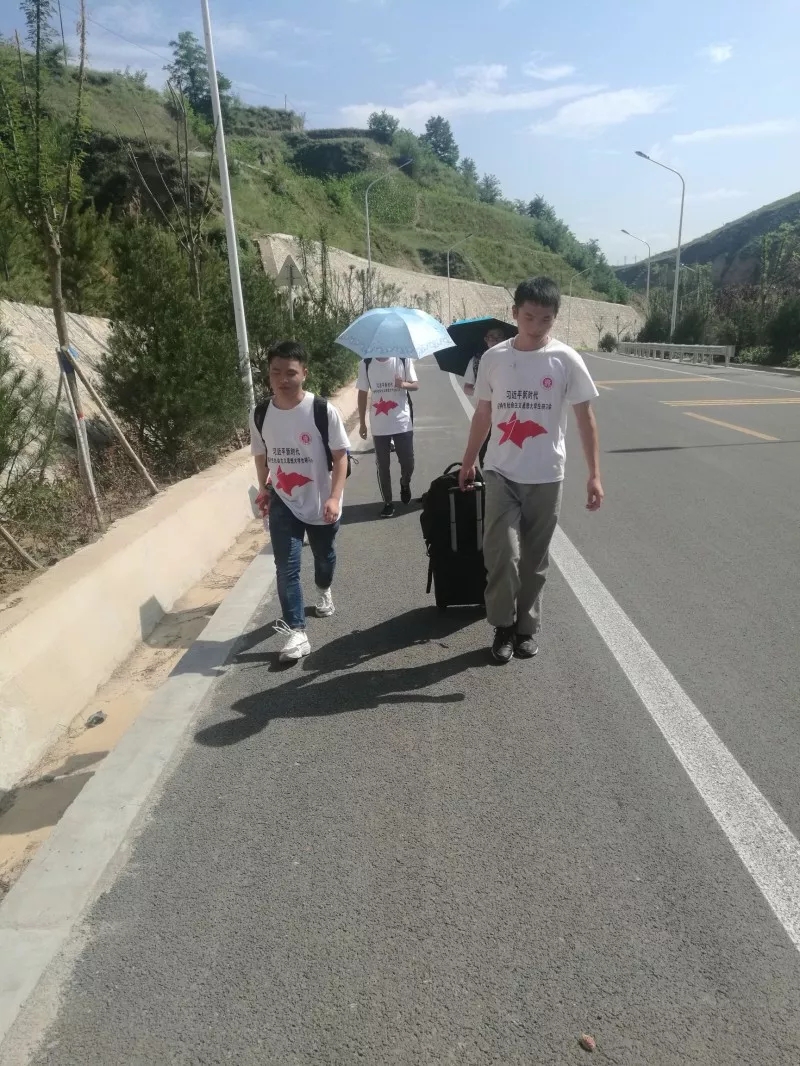 会师之后,研习会二队离开了陪伴队员们数天的兴县。在前往蔡家崖火车站的途中,队员们回想起这些天来接触了解到的革命前辈们抗战生活的种种艰难困苦,回想起习近平总书记那七年艰苦却充满意义的知青岁月。在当时那种情况下,前辈们非但没有任何畏缩,还倾尽全力发扬了那可歌可泣的红色精神,铸就了一段光辉岁月。那艰苦奋斗的精神照亮了研习二队每一位成员的心灵,点燃了大家挑战一切的热情。作为新时代的青年,红色精神不能丢!红色精神必须传承!面对着这不长却曲折回转的山间马路,是时候发扬那光辉熠熠的红色精神了!于是大家决定,步行前往车站。头顶炎炎烈日,脚踏滚烫的柏油路,长长的队伍在山间穿梭。看似不长的一段路,却因为山峦的高低起伏与山路的蜿蜒曲折而略显艰难。中途时,阵阵疲倦袭来,但研习会二队的并不准备放弃。