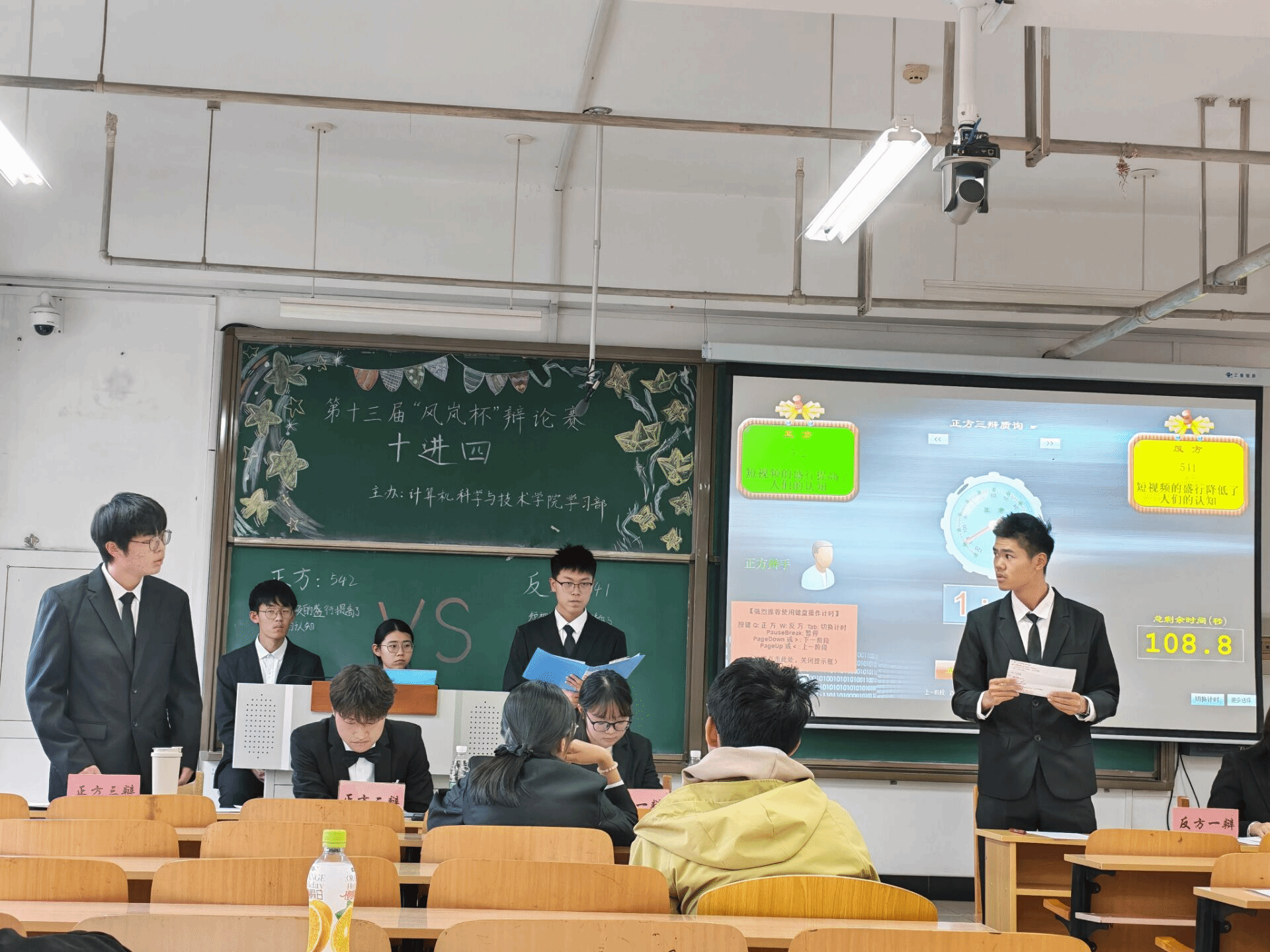 第三场辩题聚焦“短视频的盛行提高了/降低了人们的认知”,正方542班从“拓宽信息渠道、降低认知门槛”出发,结合知识传播案例论证其积极价值;反方541班针对“碎片化传播导致认知浅表化、信息茧房效应”等问题展开反驳,双方论据扎实、攻防有度。