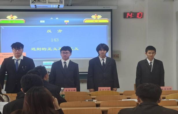第二场比赛围绕“迟到的正义是不是正义”展开探讨。正方 242 班认为正义核心价值不变,迟到仍有救赎意义,结合司法案例说明其对公平正义的补全作用;反方 143 班强调正义时效性是核心属性,迟到的正义已失本质价值,引发了现场对公平与效率的思考。