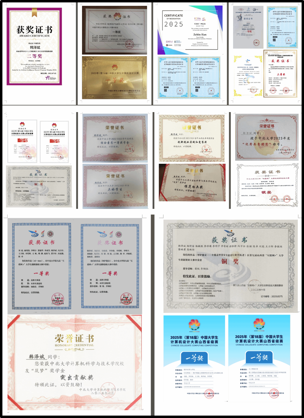 三年来,韩泽斌始终恪守朝七晚十一的作息规律,将书桌化为逐梦的赛场、以笔杆为攻坚的利刃,在专业学习中名列前茅。保研夏令营期间,他凭借扎实的专业功底与亮眼的综合素养,接连斩获中科院计算所、同济大学等10余所顶尖高校的橄榄枝,最终选择东南大学继续硕士阶段的深造之路。在校期间,他不仅揽获国家级竞赛奖项10项、省校级荣誉30余项;更先后在两个国家实验室平台实习;以第一作者和共同第一作者发表两篇CCF-A类会议论文,手握发明专利1项、软件著作权4项;获校长奖章、国家奖学金、清华大学具身智能挑战赛奖学金,综合素质特等奖学金等多项荣誉。他始终以实干笃定前行,用每一份亮眼的成绩,践行着求学途中的责任与使命。
