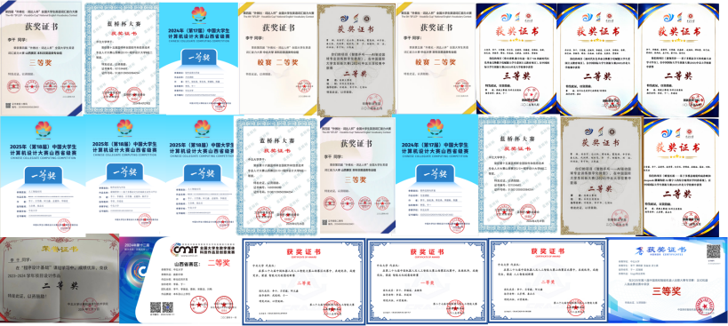 大学期间,李干勤奋笃行、锐意进取,在学业、竞赛与科研等多个领域均取得突出成绩,全面展现了新时代大学生的优秀风采。在学业与综合素养方面,他成绩优异,屡获嘉奖:不仅获得了代表本科生最高荣誉的国家奖学金,还两度荣获综合素质特等奖学金,并获评中北大学计算机科学与技术学院“筑梦奖学金”学业优秀奖。凭借全面的表现,他还获得了“校级优秀共青团员”、 “中北大学校级优秀志愿者”、“省级优秀志愿者”等荣誉称号。在学科竞赛领域,他凭借扎实的专业功底,在多项高规格国家级赛事中战绩斐然。其参赛足迹遍布中国机器人及人工智能大赛、全球校园人工智能算法精英赛、中国大学生计算机设计大赛、全国大学生数字媒体科技作品及创意竞赛、高教社杯全国大学生数学建模竞赛及蓝桥杯全国软件和信息技术专业人才大赛等,累计斩获国家级奖项十八项,省级奖项二十余项。在科研创新方面,他同样取得了实质性突破。他成功申请了五篇软件著作权和一项实用新型专利。在学术研究上,他以共同作者身份在人工智能领域的顶级会议——CCF-A类会议AAAI上发表学术论文一篇,展现了其前沿的科研探索能力。