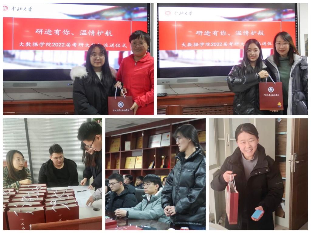 12月15日上午,大数据学院在11919H举办了“研途有你、温情护航”的考研学生座谈会暨大礼包派送启动仪式。院党委书记郭书杰、副书记杨晓东、副院长况立群、全体辅导员和毕业生班主任以及各班考研学生代表参加了派送活动。