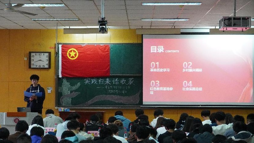 活动开始,同学们全体起立,奏唱团歌,实践归来话收获分享会也由此拉开帷幕。首先,实践部的成员刘润琦同学为我们介绍此次活动和大学生暑期社会实践的相关内容。