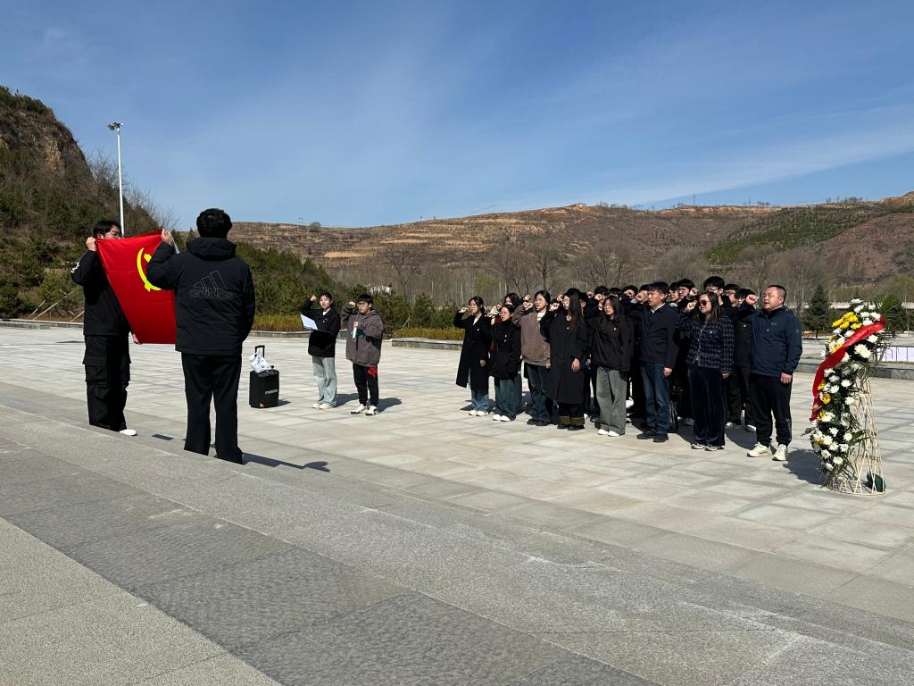 在八路军烈士陵园里,全体成员肃立高唱国歌,为烈士集体默哀。接着,来自太行干部学院的段老师饱含深情的为同学们讲述了抗战时期先烈们用生命谱写的壮丽篇章:2323名安葬在这里的烈士平均年龄仅有23.5岁;一场童稚的躲藏游戏,竟将手足之情镌刻成永恒的守望;200多具无名尸骸中只有20多位烈士找到了后人;一位腿脚不便的85岁老人远赴千里来到只为在大巴车上看一眼他二哥的栖身之地……一个个鲜活的英雄形象在叙述中矗立,一段段浴血奋战的往事直抵心扉。可歌可泣的英雄事迹带领大家一同重温那段烽火连天、山河激荡的峥嵘岁月。之后全体党员面向党旗,举起右拳,庄严宣誓。党员代表向革命烈士敬献花篮,寄托着对先烈的深切缅怀。最后全体师生们缓步绕行瞻仰纪念碑并为烈士们献上素雅白花,将他们用热血写就的革命诗篇铭记心中。