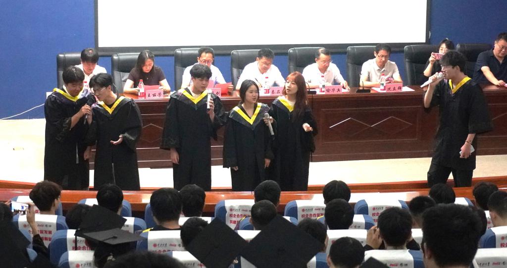 大会正式开始前,现场播放了精心制作的毕业纪念视频,一幅幅熟悉的画面带领毕业生们重温了大学四年的点滴时光——从初入校园军训时的青涩懵懂,到班级活动中团结协作的欢声笑语;从宿舍聚餐的温馨时刻,到专业学习时的专注身影;每一个镜头都记录着青春最真实的模样,每一帧画面都诉说着成长最动人的故事。随后,毕业生代表深情献唱《不为谁而作的歌》《烟火里的尘埃》《勿忘心安》等歌曲,悠扬的旋律中饱含着对青春岁月的眷恋与对同窗师友的祝福,现场洋溢着温馨而感动的氛围。