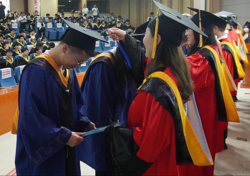 学位授予仪式环节,毕业生们依次上台,由学院领导为他们拨穗并颁发学位证书,标志着他们正式完成学业,迈向人生新阶段。